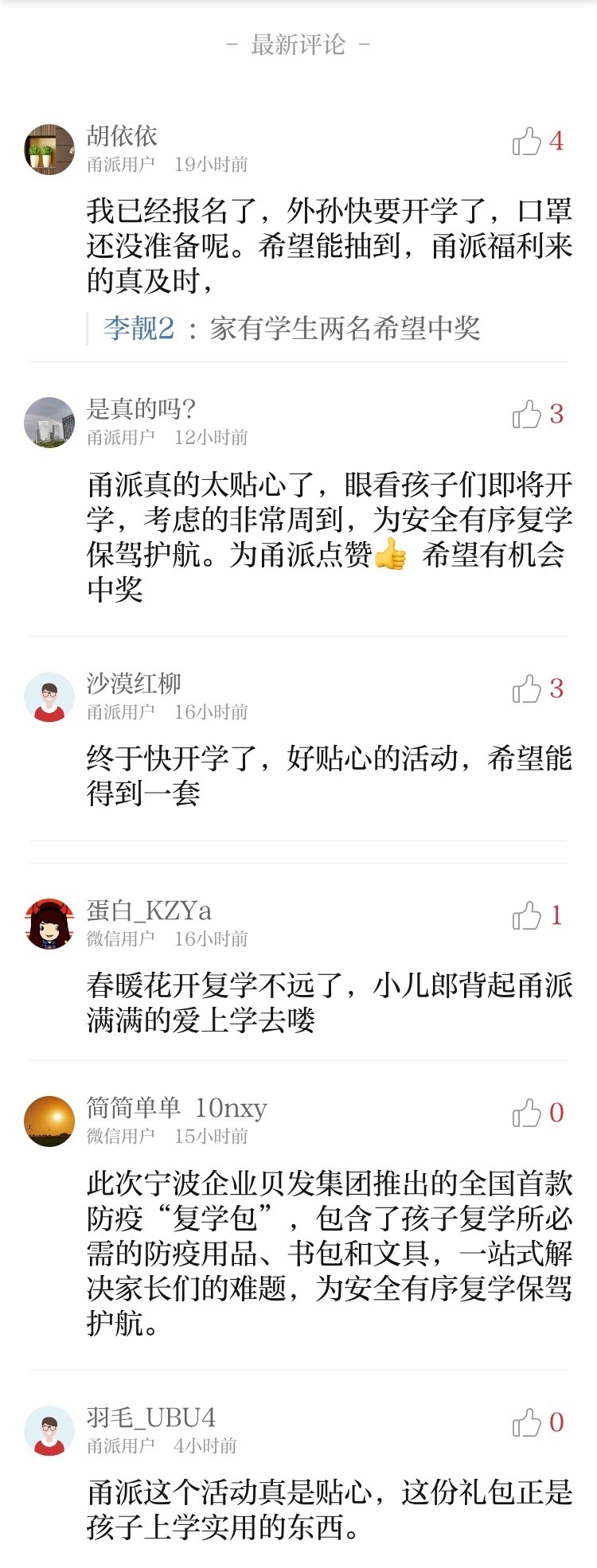 昨天,甬派向全市中小学生免费赠送100份“复学包”的报道发出后,派粉纷纷点赞评论——