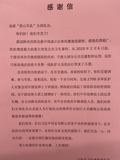 (宁波市卫健委也给“爱心车队”发来感谢信)