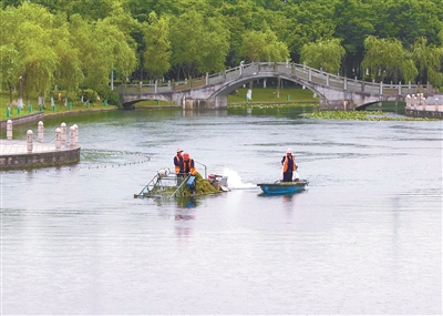 随着气温升高,鄞州城区内河中的“水下森林”一片茂盛,水草长势迅猛。5月26日,在院士公园水域,内河养护工人驾驶割草船对水草进行修剪清理。