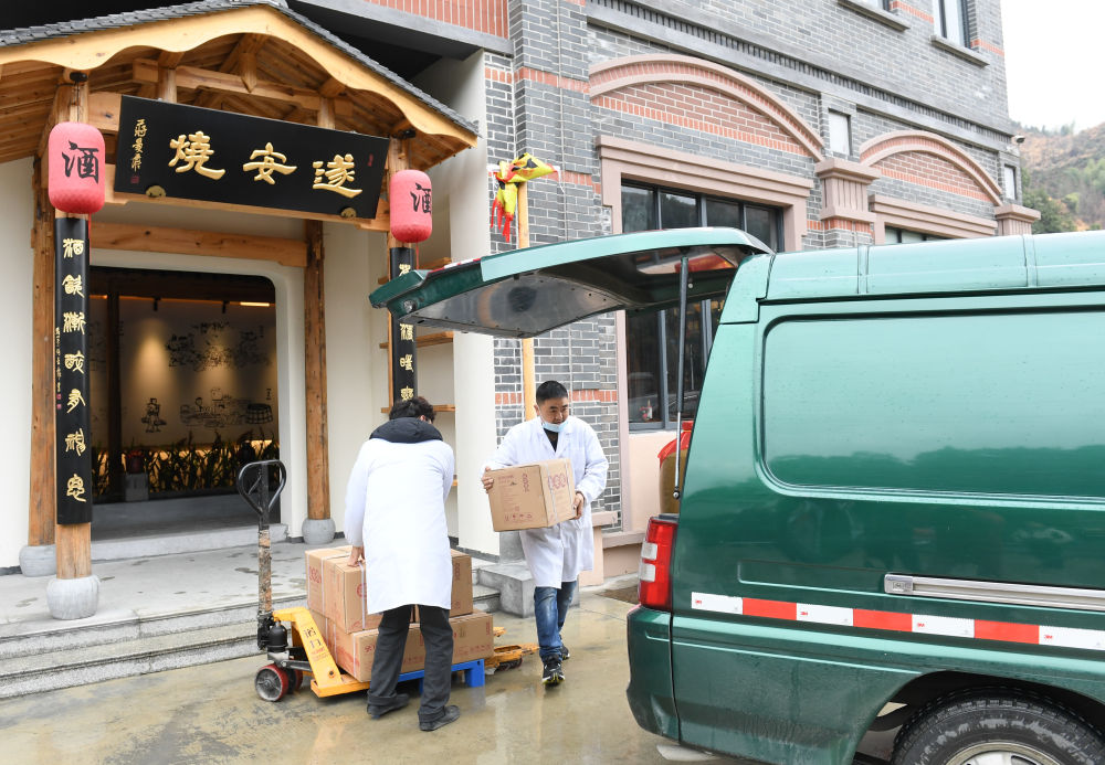 “千 岛湖·大下姜”乡村振兴联合体的配送专线车辆在淳安丰家源村装运山村土烧酒,准备送货出山(1月26日摄)。2018年,淳安县下姜村联合周边行政村成立 “千岛湖·大下姜”乡村振兴联合体,探索区域协同发展。2020年8月开始,联合体启动乡村振兴配送专线,为域内32个行政村农村电商的出货、村民的网购 进行上门服务。新华社记者 翁忻旸 摄