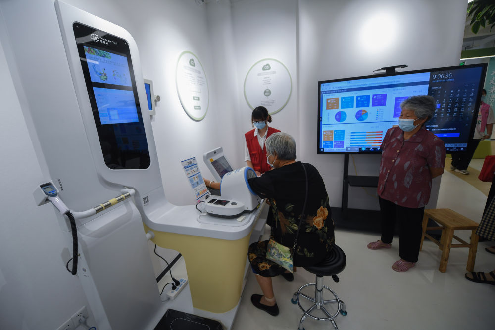 在浙江省嘉善县姚庄镇公众健康体验馆,居民在志愿者的帮助下测量身高、体重、体脂、血压等身体指标(7月13日摄)。新华社记者 徐昱 摄