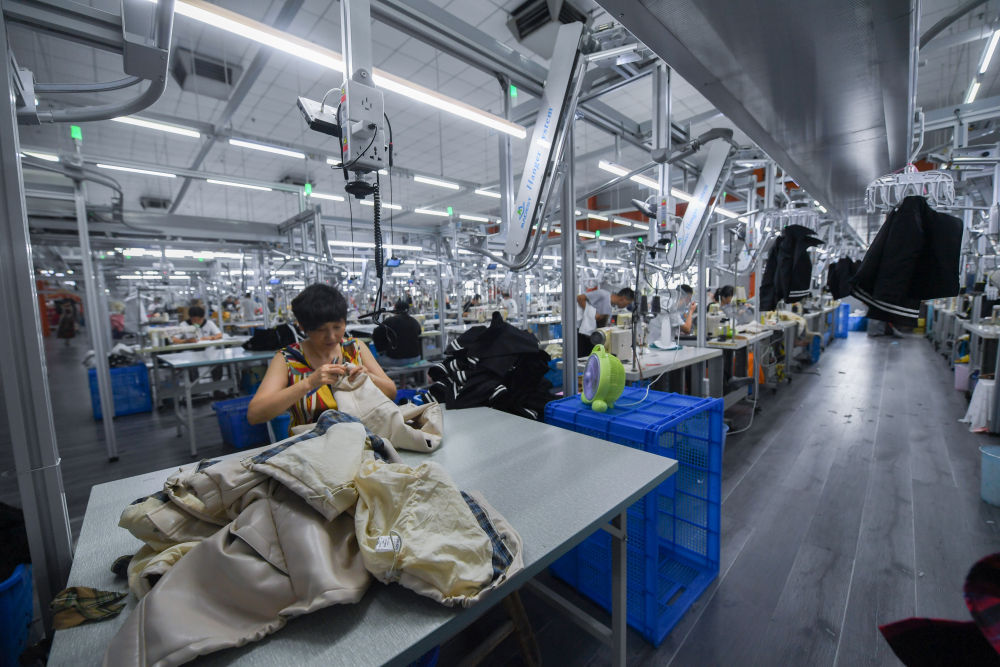 工作人员在位于浙江省湖州市织里镇的湖州朗田服饰有限公司流水线上生产童装(7月13日摄)。新华社记者 徐昱 摄