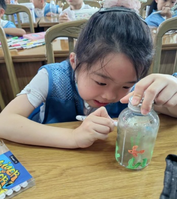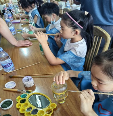 课后,工作人员同孩子们一起进行绘制活动,小朋友们纷纷拿起手中的画笔,用稚嫩却清晰的笔触,勾绘出自己理想的水环境,将一幅幅充满童趣的绘画作品绘制在废旧玻璃瓶上。在“探究、发现、创造”中进行了一次独特艺术之旅,培养孩子们保护地球、爱护水生态环境的意识和动手创造能力。