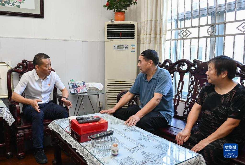 在浙江省宁波市奉化区萧王庙街道滕头村,傅平均(左)入户走访村民,听取意见和建议(9月16日摄)。新华社记者 黄宗治 摄
