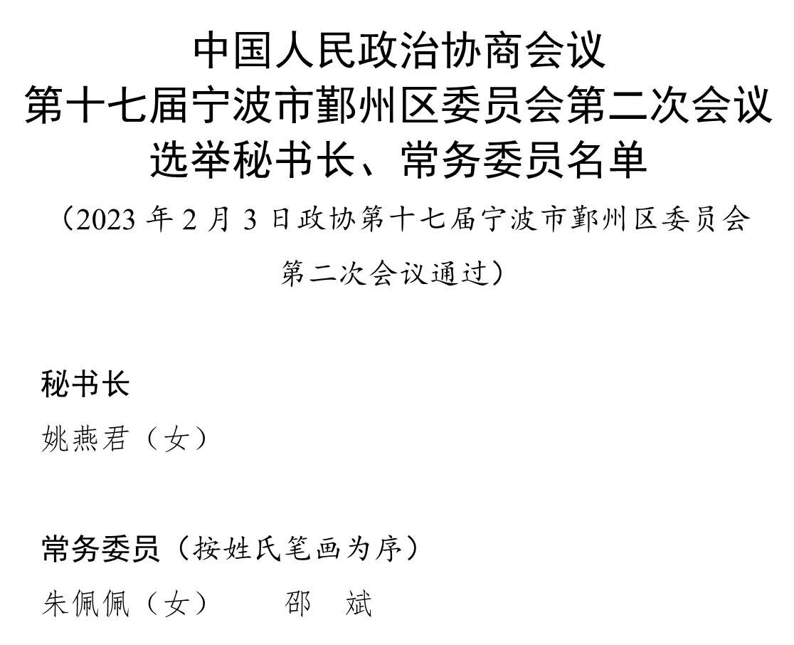 本次大会采用电子投票的方式和等额选举的办法,补选中国人民政治协商会议第十七届宁波市鄞州区委员会秘书长和常务委员。根据总监票人计票结果报告和选举办法的规定,会议宣布:姚燕君当选为中国人民政治协商会议第十七届宁波市鄞州区委员会秘书长。朱佩佩、邵斌当选为中国人民政治协商会议第十七届宁波市鄞州区委员会常务委员。