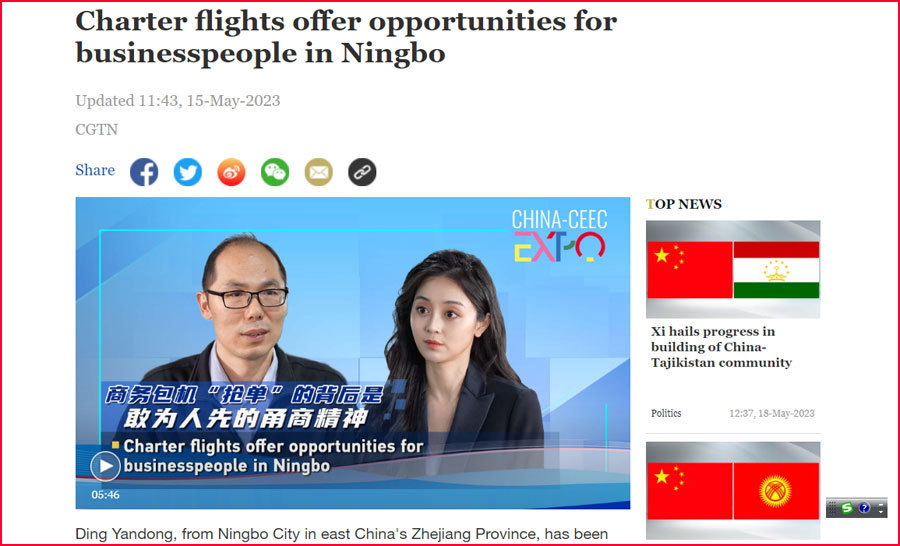 《CGTN》:Charter flights offer opportunities for businesspeople in Ningbo