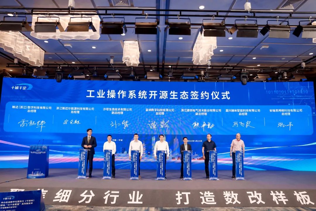 作为跨城建圈的重要一环,大会举办工业操作系统开源生态签约仪式,蓝卓同浙江捷创电气技术股份有限公司、沙塔信息技术有限公司、嘉兴赫米智能科技有限公司、浙江斯迈尔能源科技有限公司、安瑞思网络科技有限公司、触达(浙江)数字科技有限公司等企业现场签约,基于supOS工业操作系统打造“1+1”工业软件产业链服务经济圈,组团赋能省内企业实施数智化转型,并向省外辐射。
