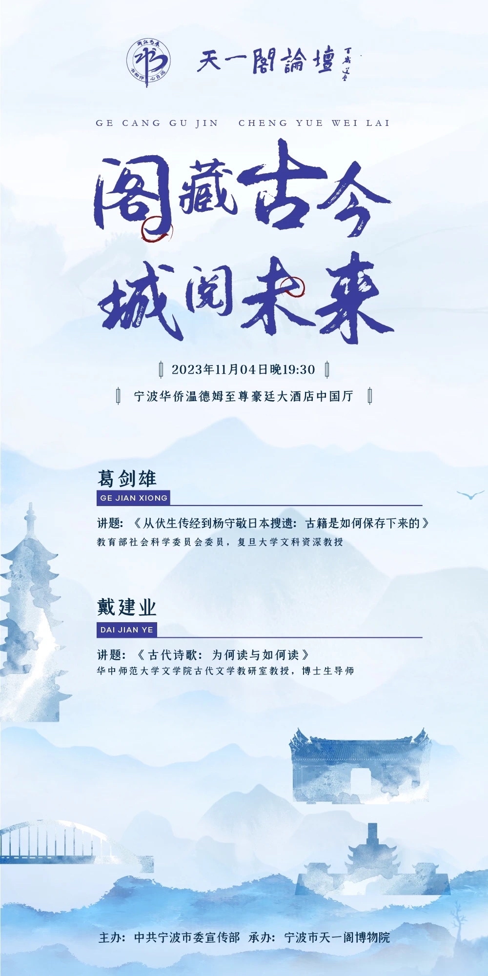 11月4日19:30,天一阁论坛将在宁波华侨温德姆至尊豪廷大酒店中国厅举行。届时,两位风格迥异的大咖将亮相现场,分别带来《从伏生传经到杨守敬日本搜遗:古籍是如何保存下来的》《古代诗歌:为何读与如何读》两大主题演讲。