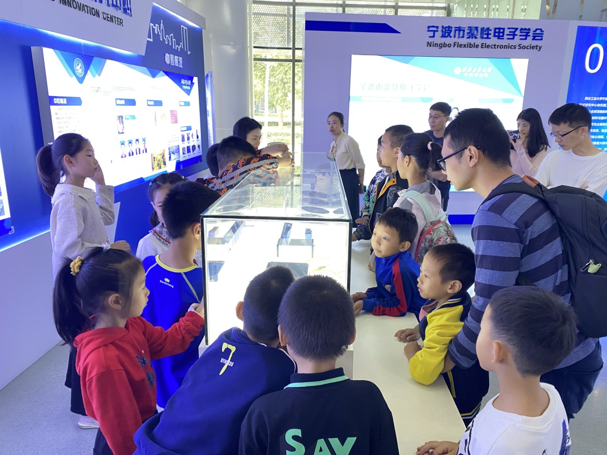 走进西工大宁波研究院综合展厅,柔性电子、智能传感器芯片、火箭发动机、无人潜航器、智能睡眠舱、微小卫星……各式各样的高科技产品、模型映入眼帘,孩子们带着对科学的好奇心和探索欲,兴致勃勃地围在展品前。“这架Y-20是中国最大的运输机。”讲解员边介绍边与孩子们互动,家长也跟随“蹭课”,并时不时拿出手机拍下孩子们认真聆听的可爱模样。“第一次走进去,我就觉得很刺激,因为这里摆放的展品我都没有见过。”茹琳琅小朋友说。