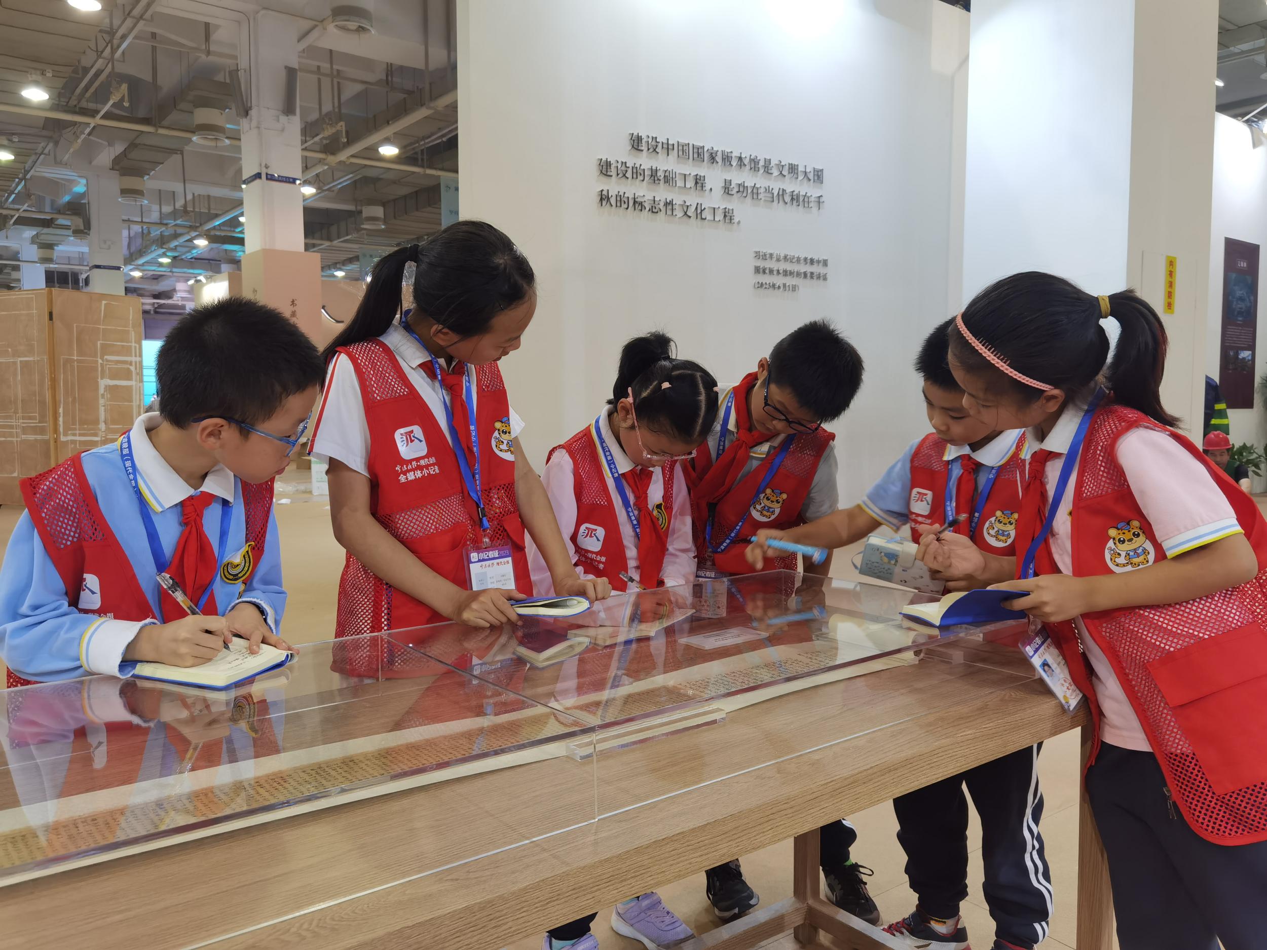 小记者们对杭州国家版本馆的展品进行观察和讨论。褚笑寒 摄