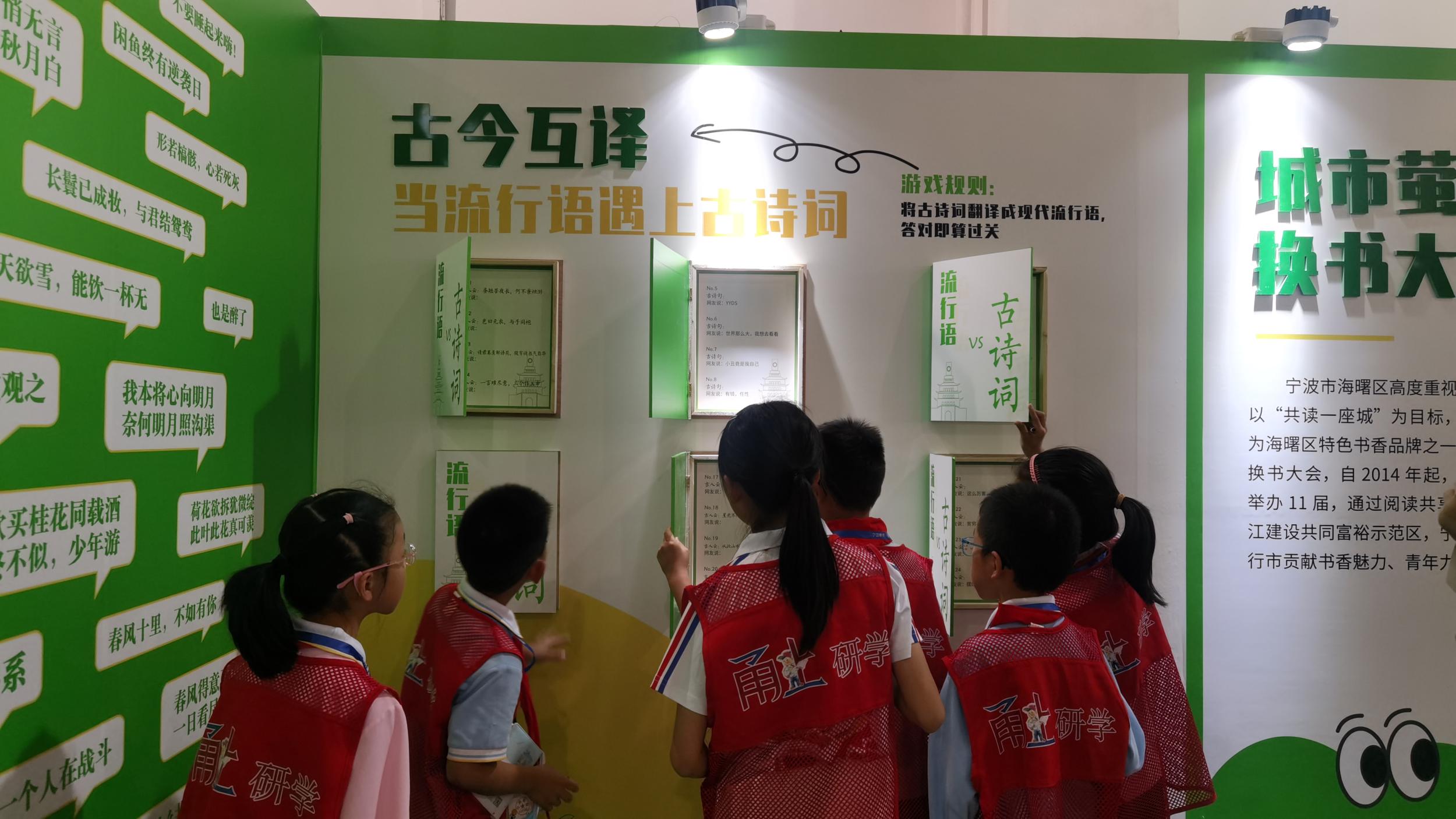 而到了“萤火虫换书大会”专区,又有了新玩法。这里除了可以交换闲置书籍外,还有一个“古今互译”的小游戏。游戏规则是将古诗词翻译成现代流行语,或者将现代流行语翻译成古诗词。“比如‘躺平’,哪首诗有类似的含义?”工作人员现场考了考小记者们。看到大家苦思冥想的样子,工作人员笑着给出答案:“今朝有酒今朝醉,这就是古人的躺平状态。”