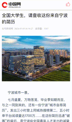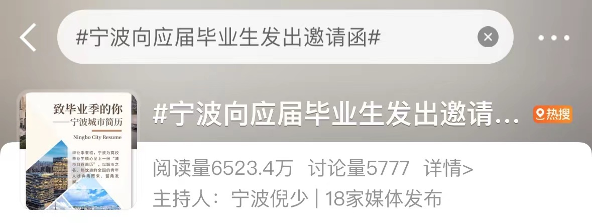 发布3小时登上微博同城热搜榜第二,单平台流量破6000万,人民日报客户端、澎湃新闻、光明日报信息网等多家主流媒体和腾讯、搜狐、凤凰等多家商业媒体转发,全国多地网友纷纷点赞……随着城市简历的热度持续发酵,宁波惜才、爱才之诚意再次成为网友口中的热谈。