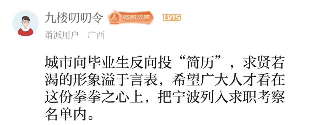 派粉“九楼叨叨令”以一句“希望人才把宁波列入求职考察名单”,为城市简历加油——