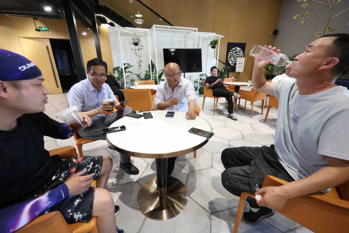 网约车充电中,司机来到休息室一起聊天喝饮料。