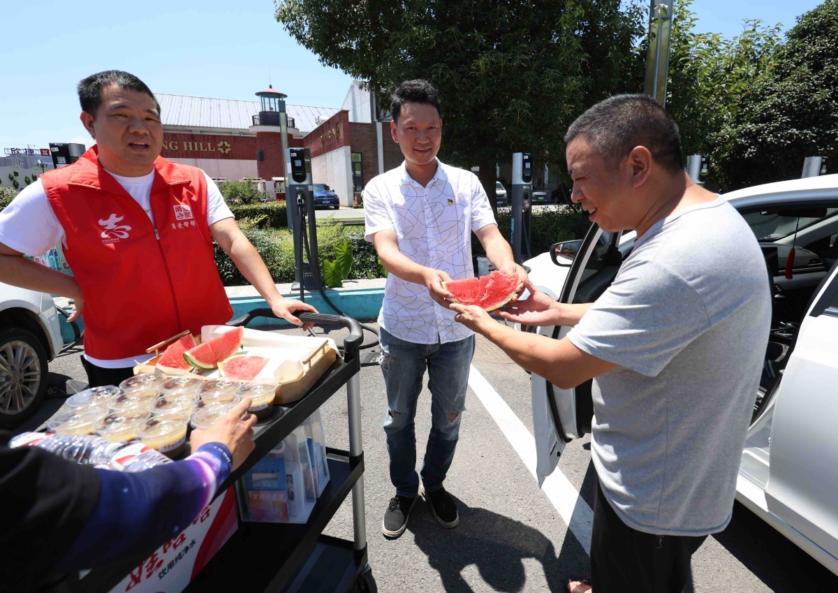 一大早,滴滴雷锋车队和“甬爱e家”的工作人员带着防暑降温物资来到现场,并设置了休息区、饮水点,确保司机们能够在这里享受到舒适的纳凉环境。每当有司机进站充电,志愿者便会立马将西瓜、矿泉水、绿豆汤、防暑药等物资递到他们手中,并热情邀请他们去休息区休息。