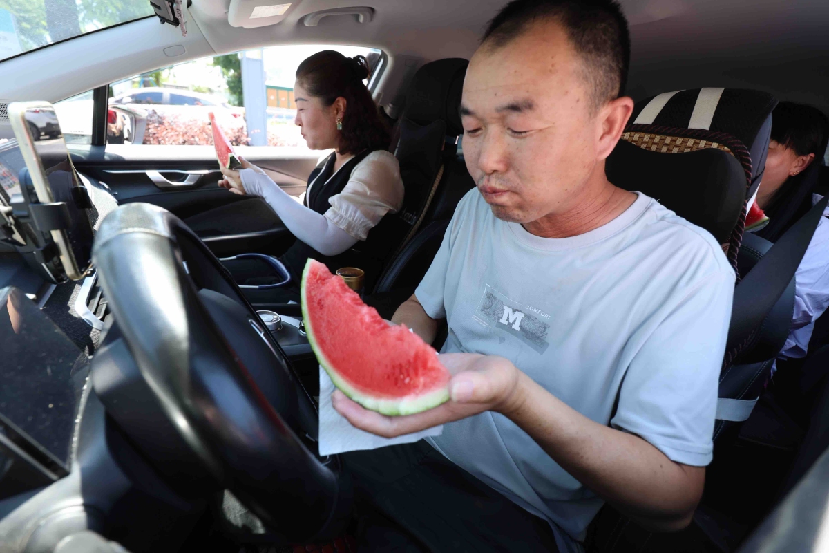 车内打开空调,网约车司机们边吃西瓜边聊天。