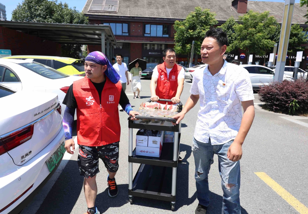 志愿者给网约车司机送西瓜、绿豆汤等物品。