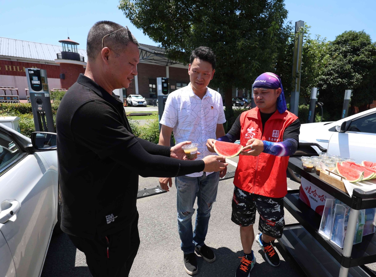 “师傅,天气这么热,辛苦了啊!”在江北区委社会工作部的牵头下,文教街道“甬爱E家”江北枢纽站在宁波文创港充电站设置固定点位,“牵手”滴滴出行雷锋车队,一同开启送清凉行动。陆续赶来充电的网约车司机都收到了一份心意满满的清凉礼物。