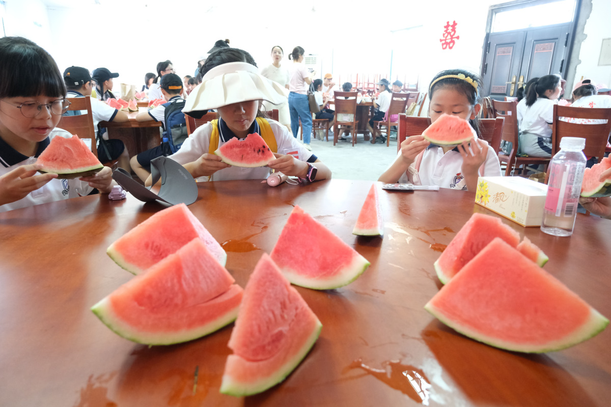 思政课上,小学生变成“吃瓜群众”,吃上了原产地正宗八戒西瓜,还为八戒西瓜想出了响亮的广告词:“八戒西瓜 脆甜多汁”“吃八戒西瓜 口感顶呱呱”……