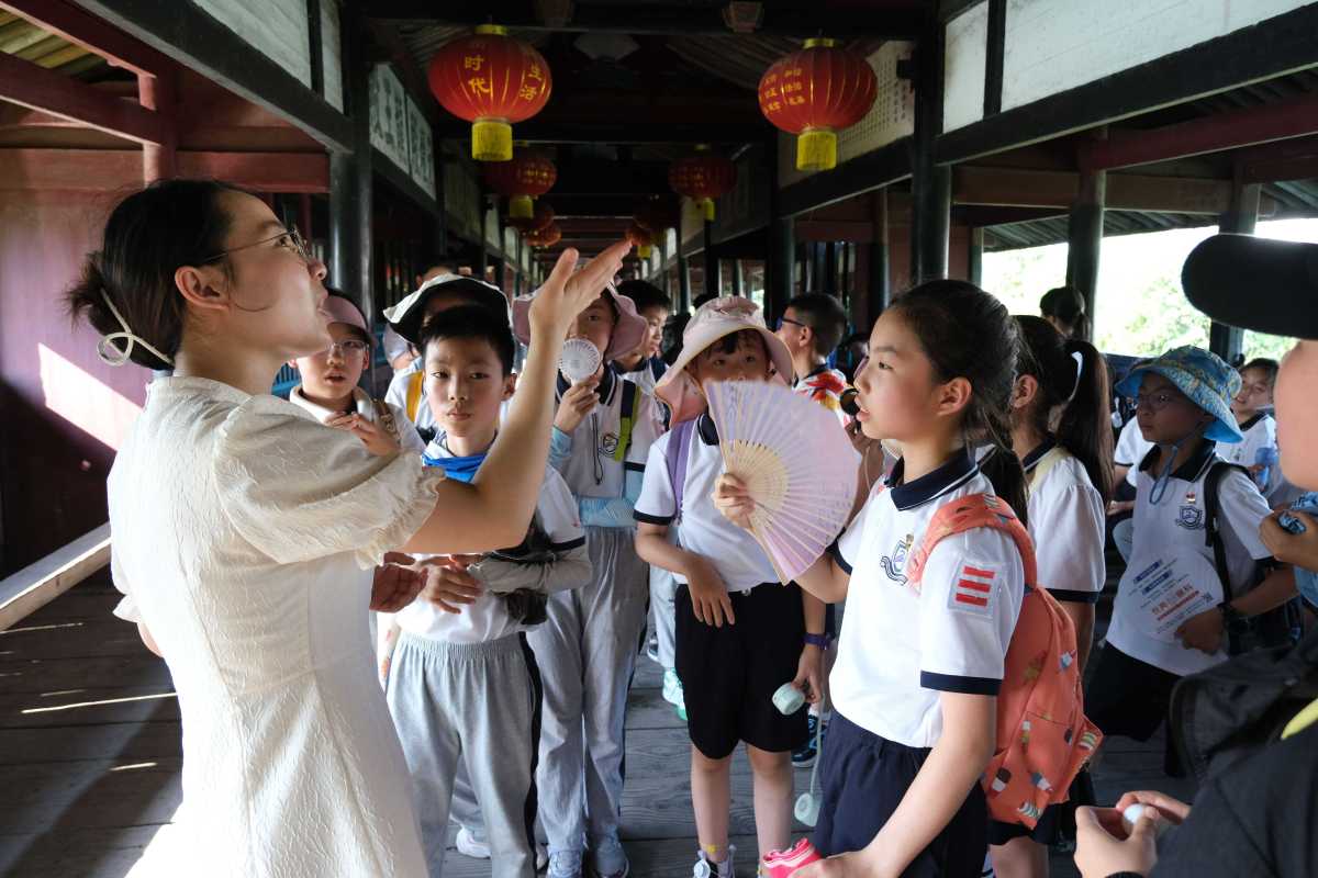 “你看这座桥木质结构,廊屋保护了木梁,石砌桥墩制成船形,经历上百次洪水江潮袭击屹立不倒,蕴含着古代工匠的智慧和汗水。桥上风光无限,有人把它和七塔寺放在一起写了副对联:‘七塔寺,七座塔,塔塔朝天天朝塔;百梁桥,百根梁,梁梁映水水映梁’,是不是很有意思?”严然的生动讲解,让小学生在直观感受桥梁特点外,还对传统文化有了价值认同。
