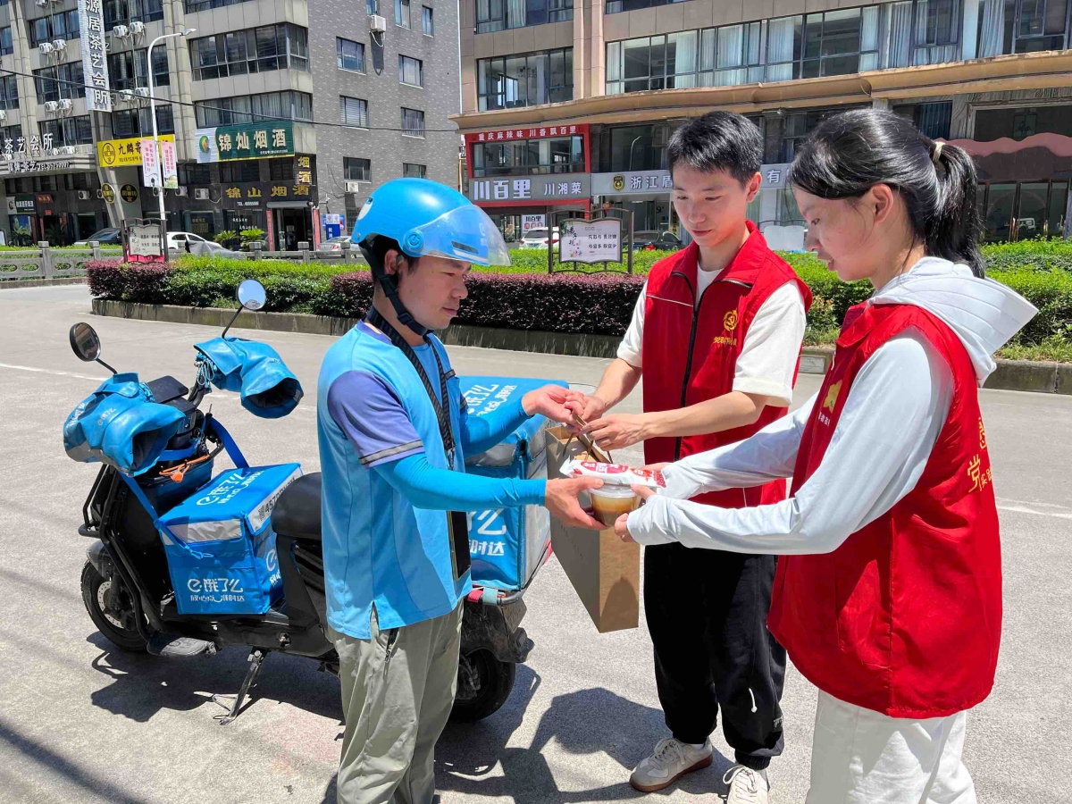 在桃源街道华庭社区的“甬爱e家”小哥驿站,华庭社区各网格的网格员与华庭社区新时代文明实践站招募的大学生志愿者们正开展着“情系一线,夏送清凉”活动。