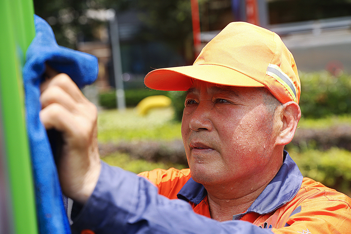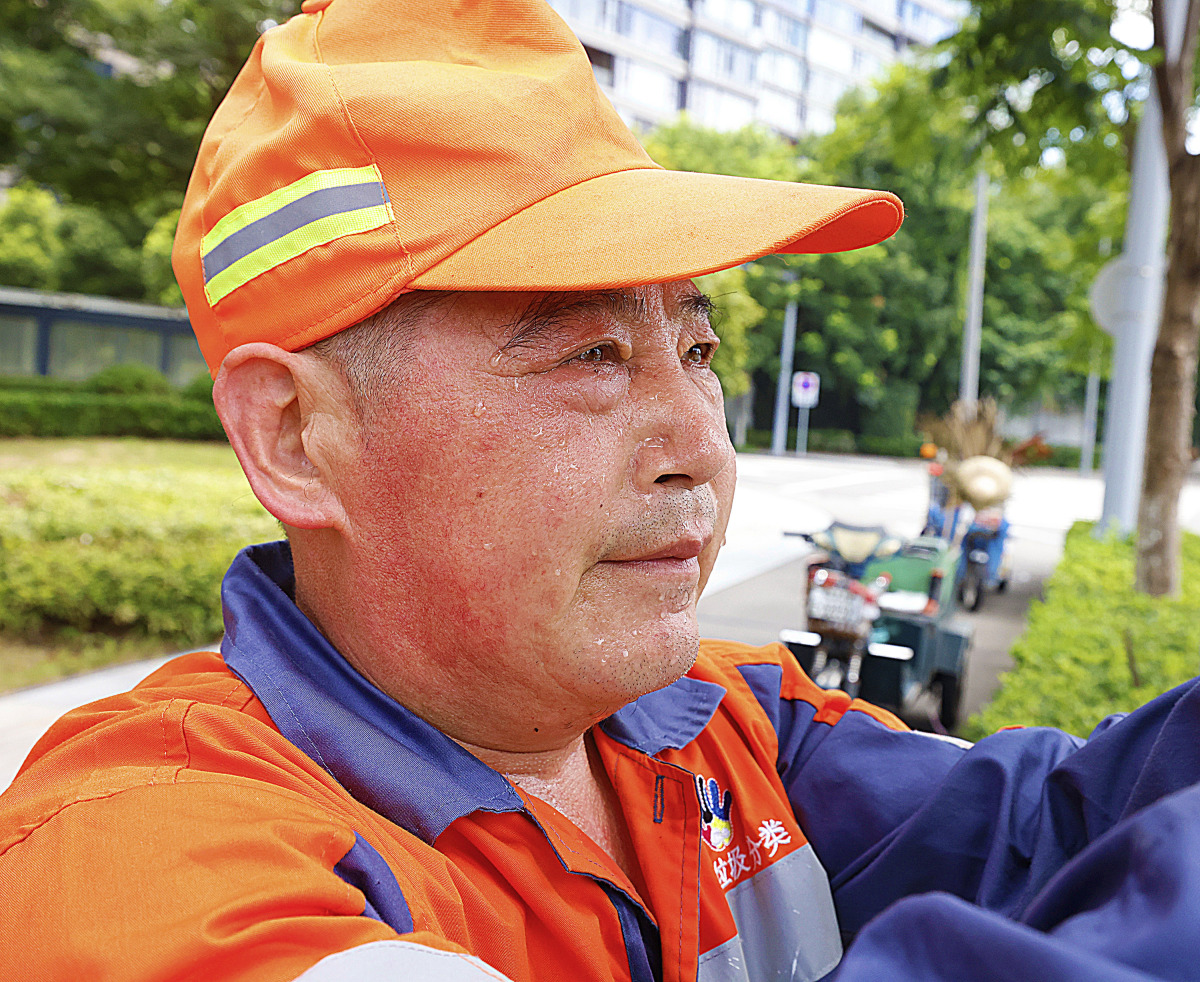 7月9日10点,他刚刚结束上午的工作,此时室外温度高达35℃,道路两旁的绿荫也难以抵挡高温天的炽热。郭师傅大口大口地喝着矿泉水,豆大的汗珠不断滴落。