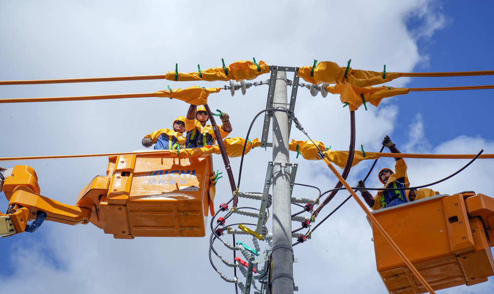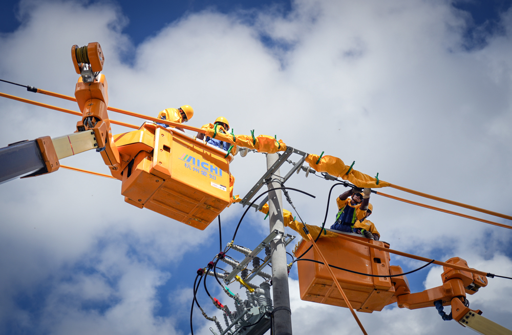 戴好绝缘头盔,穿上厚重的黄色绝缘衣;在绝缘斗臂车的助力下,升至离地10多米高的半空……