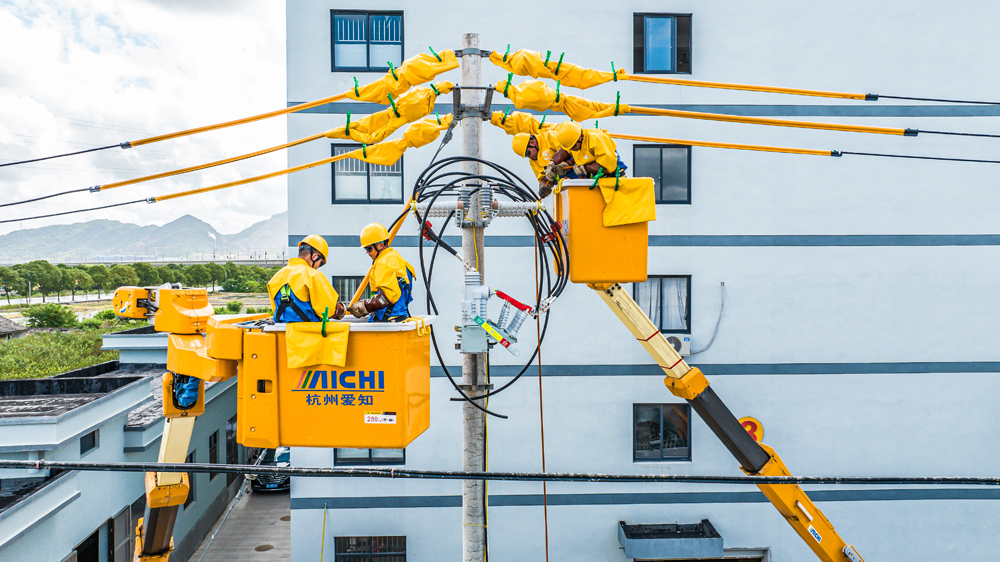 奉化区供电公司带电作业中心员工正在带电安装智能开关。本文图片由陈章升、盛家豪、郑瑜摄