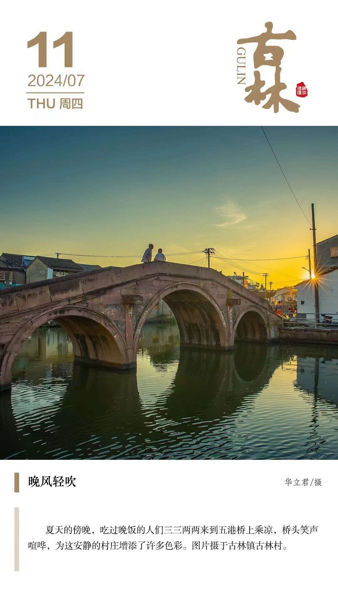 7月26日,当海曙区古林镇的党委委员洪琦翻看朋友圈的时候,果然找到了省级文化特派员、宁波大学东海研究院叶胜超博士发表的这首《诗话古林57》。下面还配了一张照片,画面是古林镇的落日生辉。而这也是洪琦在朋友圈分享的“古林每日一景”。