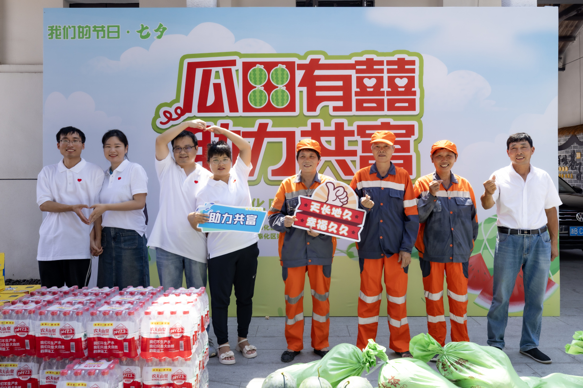 本场集体婚礼还融入了公益元素,成了一场传递爱心、助力共富的盛会。大堰镇一困难农户种植的西瓜今年丰产,但因家人住院急需陪伴照顾,眼看西瓜上市正愁售卖。在奉化区民政局的协调对接下,新人与奉化区绿叶志愿服务协会的志愿者一起销售西瓜,协助获得收入3300余元。新人们捐赠了40箱矿泉水、20箱冰红茶、60个西瓜,并分成不同小组,分别前往街头巷尾为环卫工人“送清凉”。