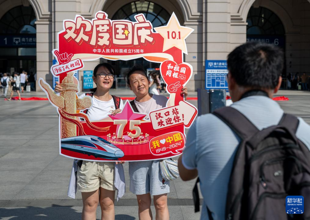 9月29日,中国铁路武汉局集团有限公司在汉口火车站广场开展迎国庆快闪活动,旅客合影留念。