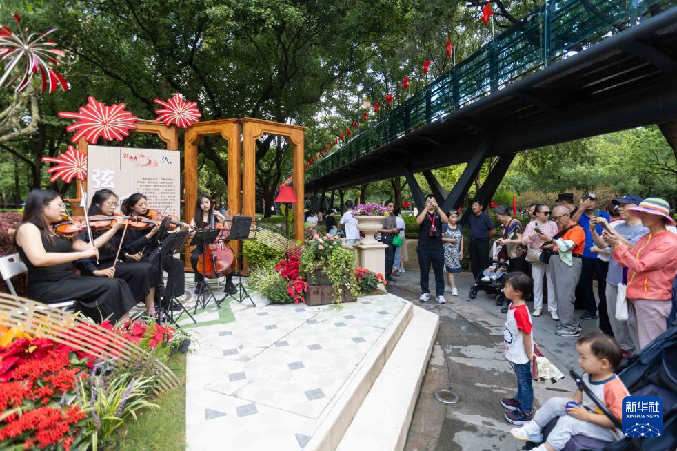 9月29日,上海市徐汇区庆祝中华人民共和国成立75周年游园会在徐家汇公园举办,人们欣赏来自上海音乐学院的弦乐重奏演出。