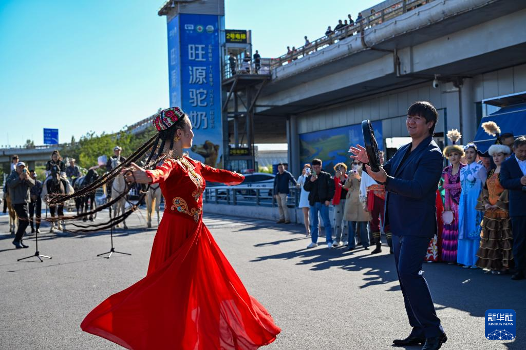 9月29日,在乌鲁木齐地窝堡国际机场T3航站楼外广场上,乌鲁木齐市艺术剧院演员进行民族歌舞表演。