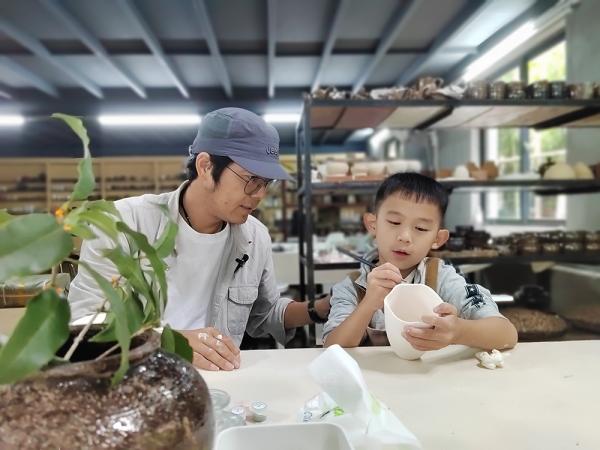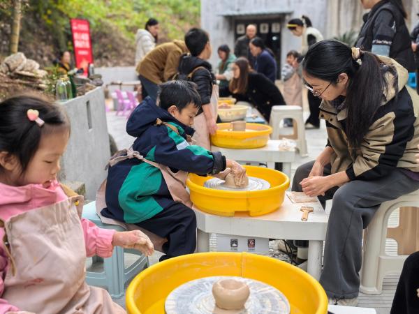 家长孩子体验陶器制作技艺。