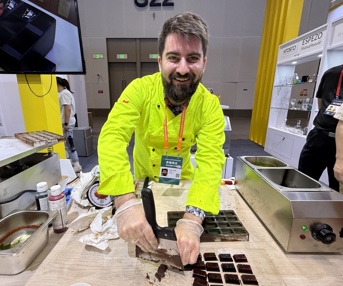 匈牙利巧克力品牌Hmmmm负责人Csatai Laszlo现场表演巧克力制作。记者 严瑾/摄