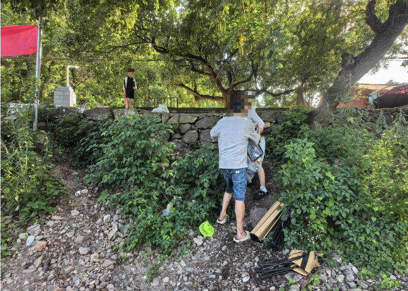 记者沿溪往上游走了200多米,在一个马术俱乐部边,也看到几个孩子在溪流中玩水。有个男子拎着折叠桌,要从溪边小路下到河滩,因为坡陡,一不小心摔了下来,重重磕了一下,痛得直龇牙。