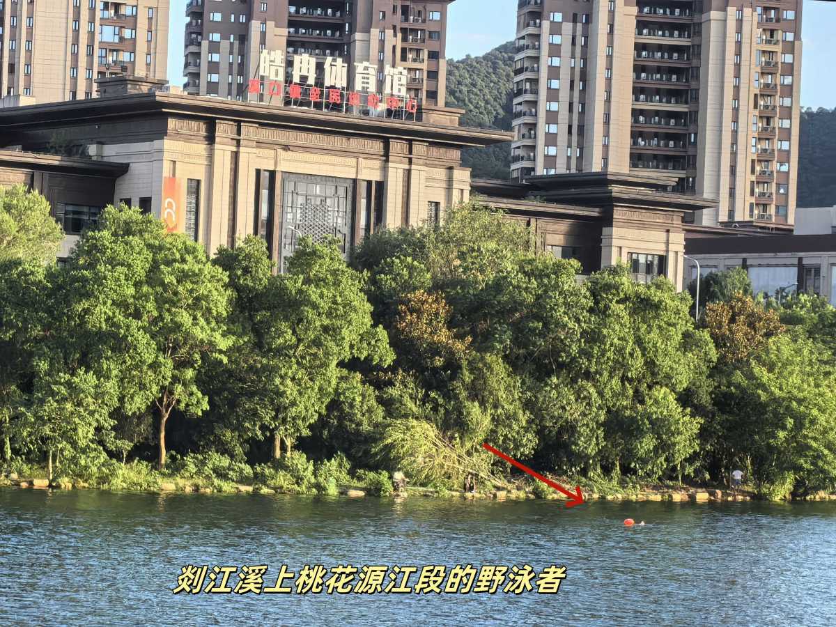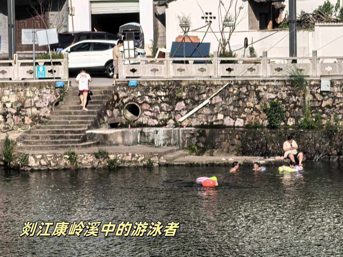 之后,记者返回溪口镇区。剡溪中学面前的剡江中拉起了网,形成一个天然泳池,前来游泳消暑的大人、孩子不下百人。