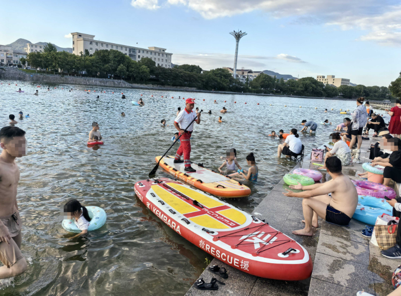 泳池中,有身着“红十字”T恤的安全员划着桨板,在深水区一边划行,一边观察游泳者的情况。泳池外面,还停着一辆奉化区红十字会红海应急救援车。一位红海应急救援队队员告诉记者,这里是溪口镇唯一的正规天然泳池,每年7月1日起开放。