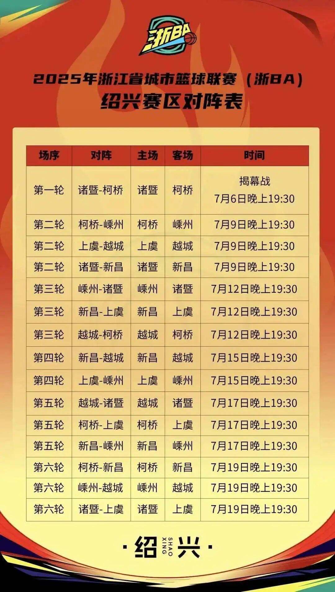 绍兴赛区预选赛将于7月6日至7月19日在各队主场举行,首场比赛是同山烧与黄酒的较量(诸暨市代表队VS柯桥区代表队)也是“浙BA”的揭幕战。绍兴地区冠军队将参与角逐全省城市代表队总冠军。
