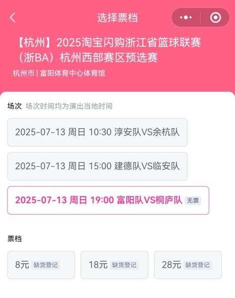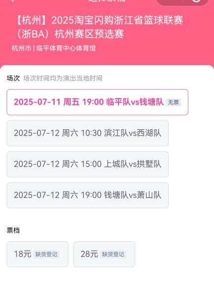 截至7月10日傍晚发稿,7月11日晚上临平对阵钱塘、7月12日上城对阵拱墅、钱塘对阵萧山、7月13日晚上建德对阵临安、富阳对阵桐庐以及经开代表队对阵海盐等多场比赛的各个票种已在大麦网开票不久后便售罄,均处于缺票登记的状态。