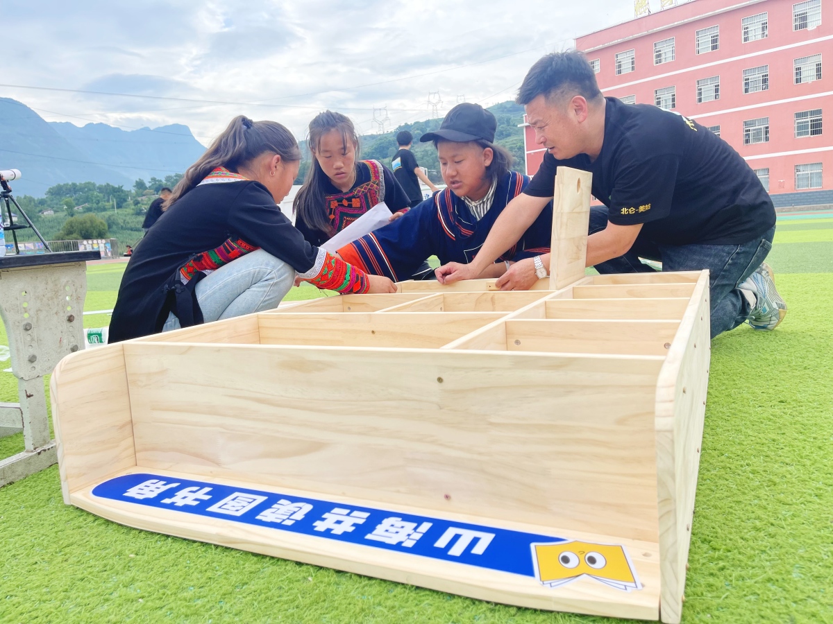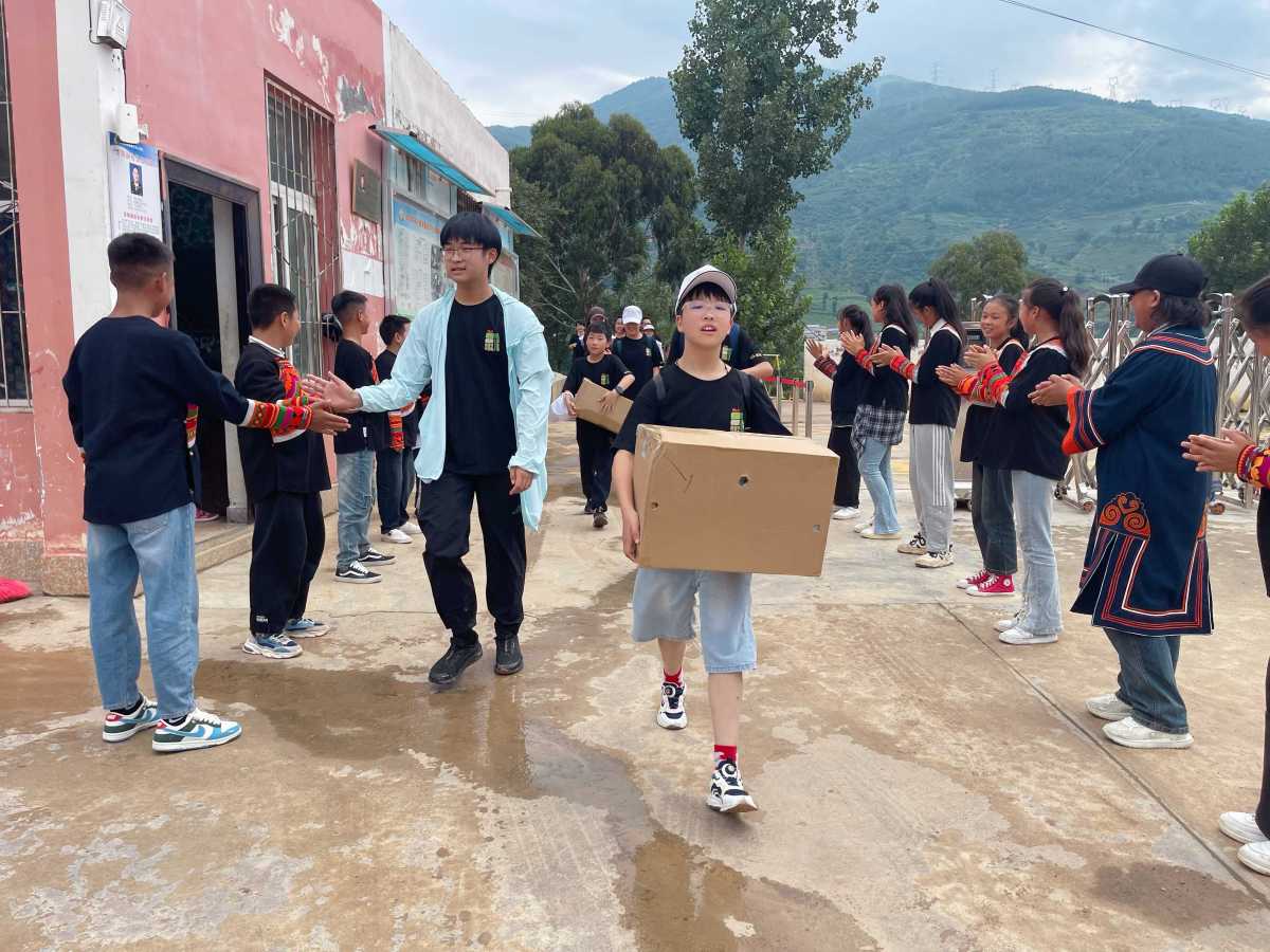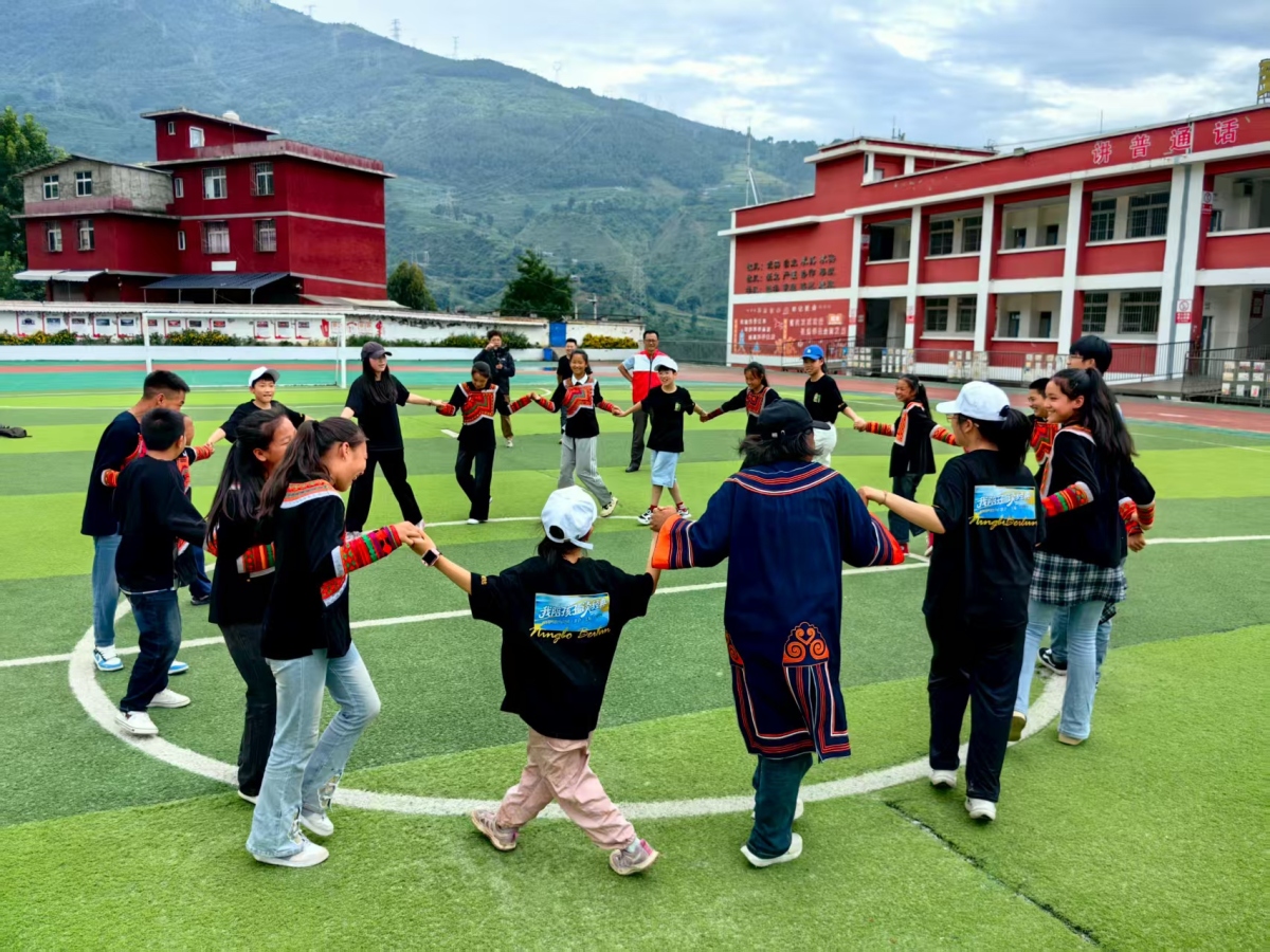 蓝天之下,彝族传统达体舞的韵律流淌开来。彝族伙伴牵起宁波孩子的手,手把手引导,跺脚声、欢笑声在群山中交织回荡。舞蹈余韵未歇,两地少年已并肩组装十个崭新书架。