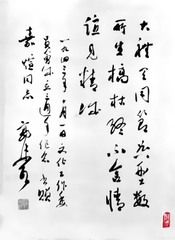 这是1943年郭沫若亲笔为乐嘉煊题写的赠诗,可以看出郭沫若对乐嘉煊的器重和勉励,诗中概括了郭沫若与青年世界语者乐嘉煊在抗战中一段真诚的革命友谊。