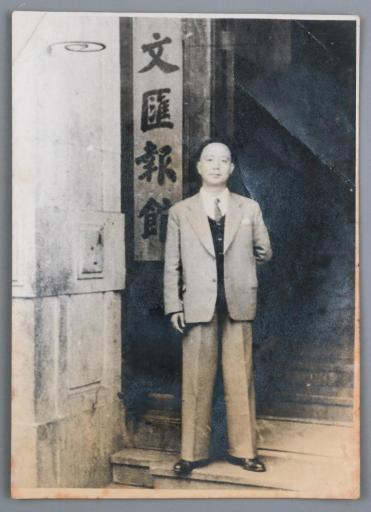 唐弢在文汇报馆门口留影