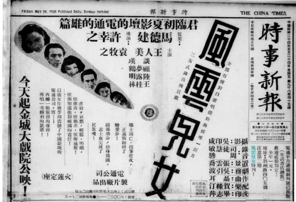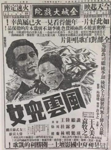 《风云儿女》在金城大戏院举行首映式的媒体预告