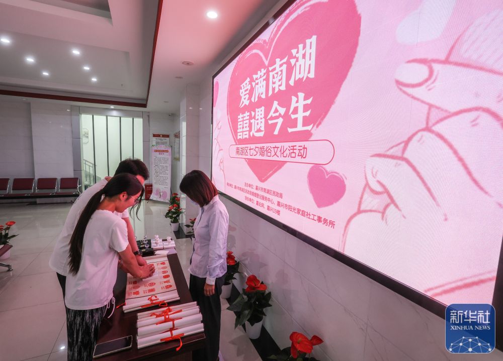 8月26日,一对新婚夫妻在嘉兴市南湖区民政局婚姻登记服务中心参加七夕婚俗文化活动。