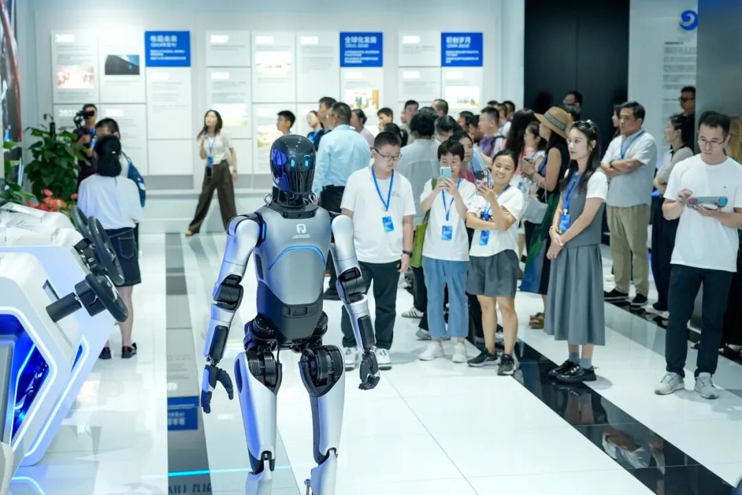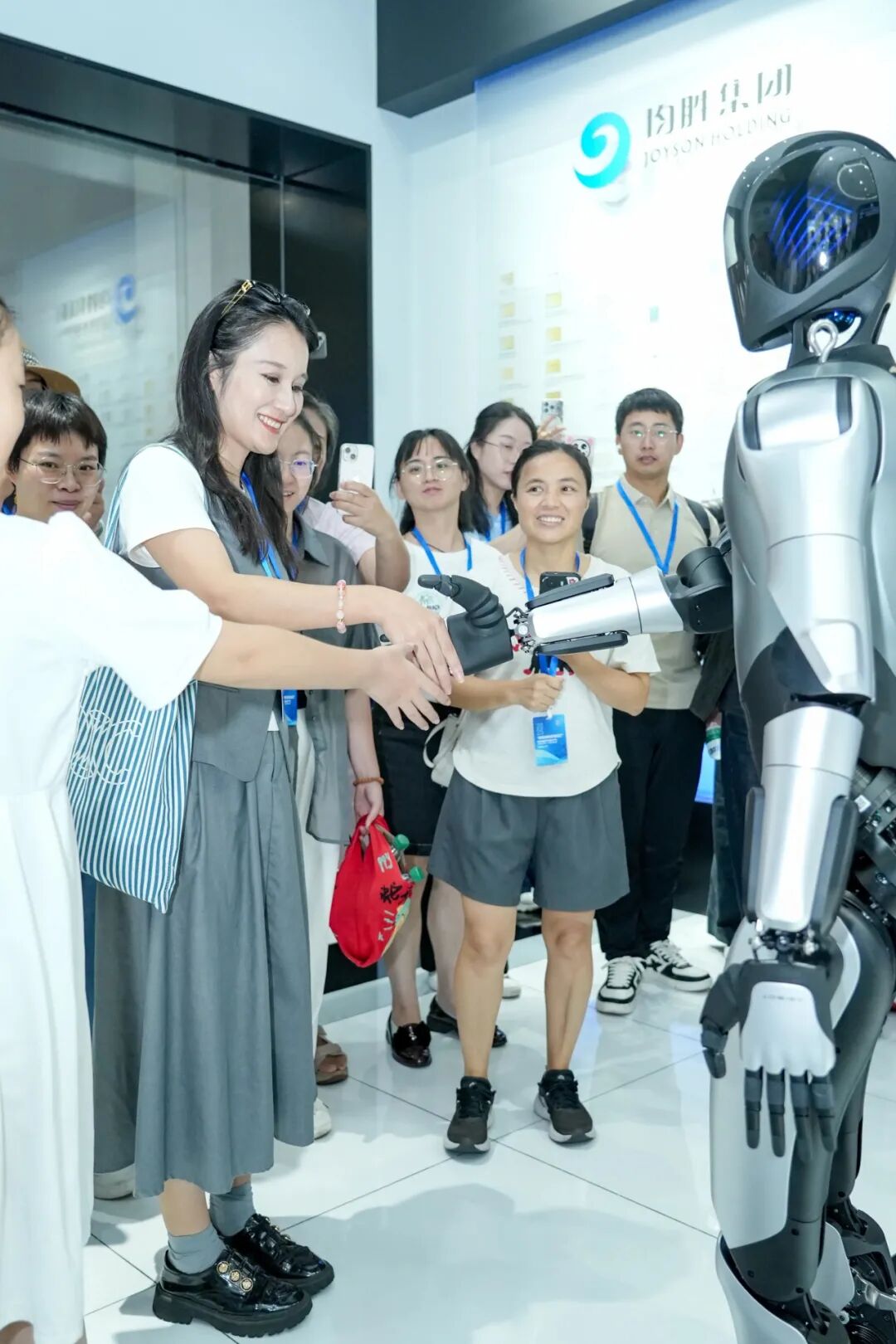 孩子们一下子围了上去,眼睛里闪着光。一个小男孩小心翼翼地伸出手,机器人轻轻握住他的手掌,他立刻回头朝妈妈喊:“妈妈!它会跟我握手!”家长们看着孩子与机器人互动的模样,笑着点头——原来智能制造不是冰冷的生产线,而是能带来欢乐的“新朋友”。