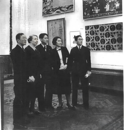 励乃骥(左一)、傅振伦(右一)在莫斯科苏联中国国际艺术展览会现场
