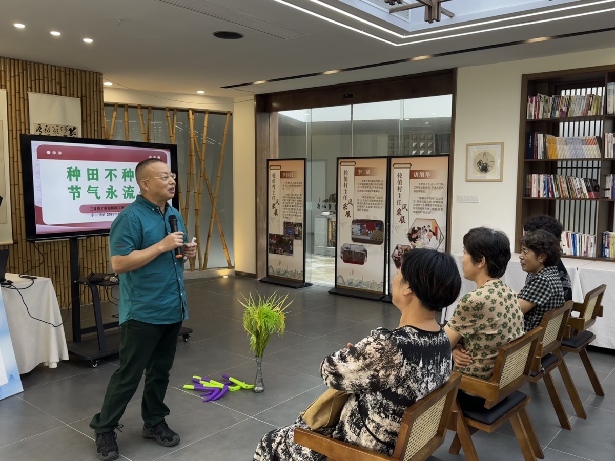 从春耕夏耘到秋收冬藏,从节气农谚到现代生活启示……他以“种田不种田,节气永流传”为题,用通俗生动的语言为在场村民讲解节气知识,传递日常生活阅读理念。