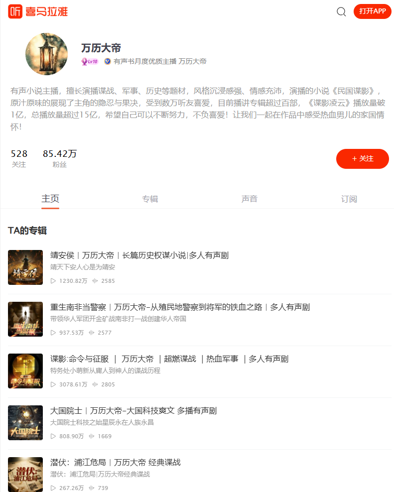 在喜马拉雅平台上,“万历大帝”的演播作品已超过百部,总播放量突破15亿。其中《谍影凌云》单专辑播放量破1亿,另有四部作品同样跻身“破亿俱乐部”。