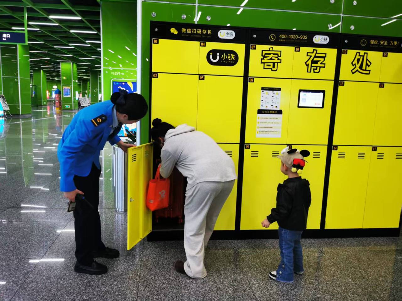 图为儿童公园站工作人员教乘客使用智能寄存柜。